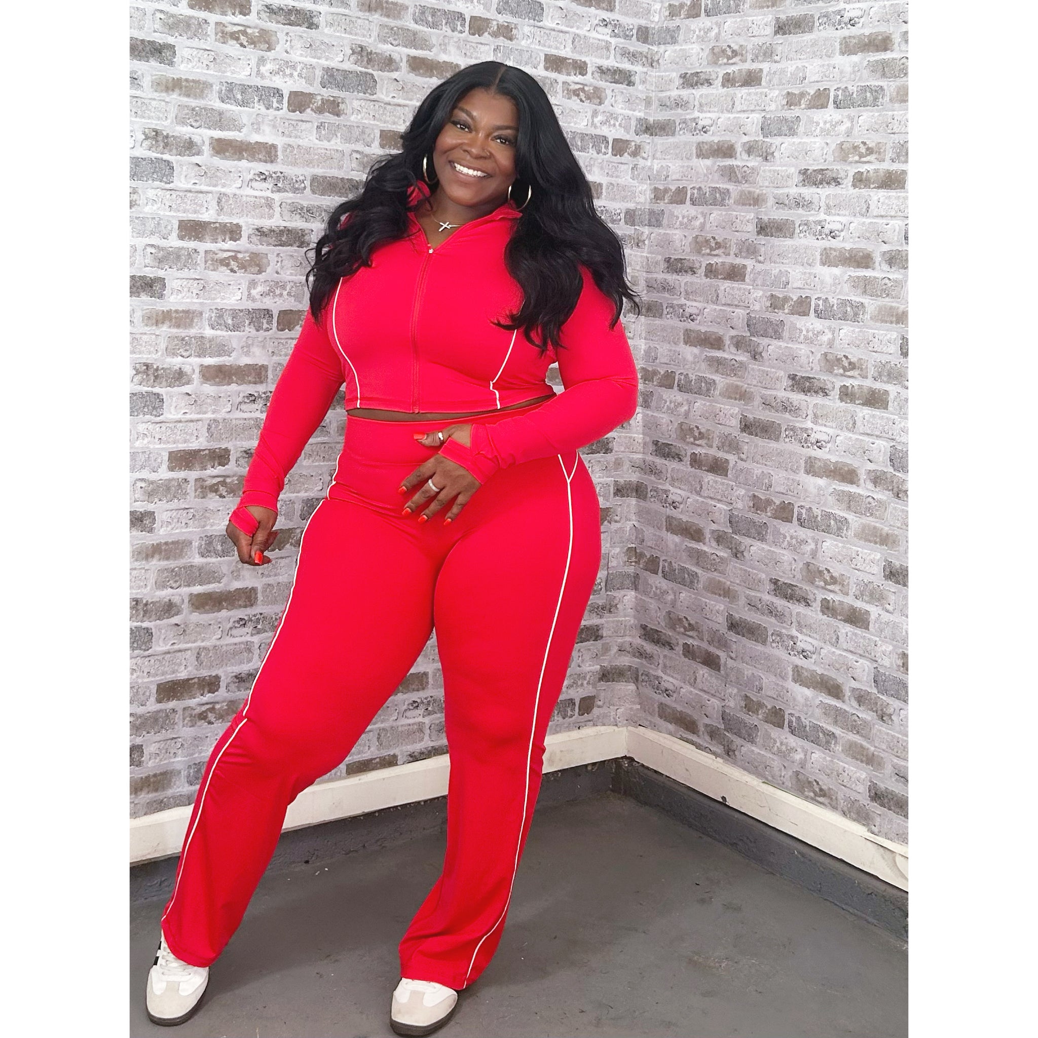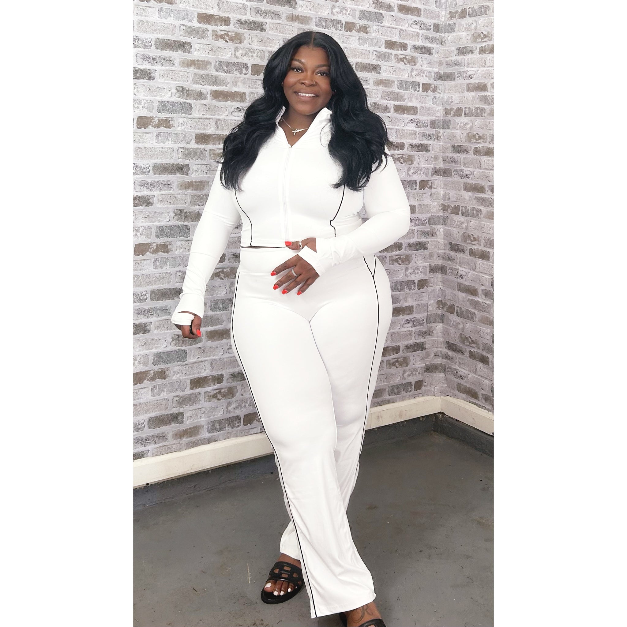 High quality activewear set with high waist compression yoga pants with matching jacket with thumb hole and piping stitch detail. Made with 75% Nylon and 25% Spandex. Modeled in a size XL