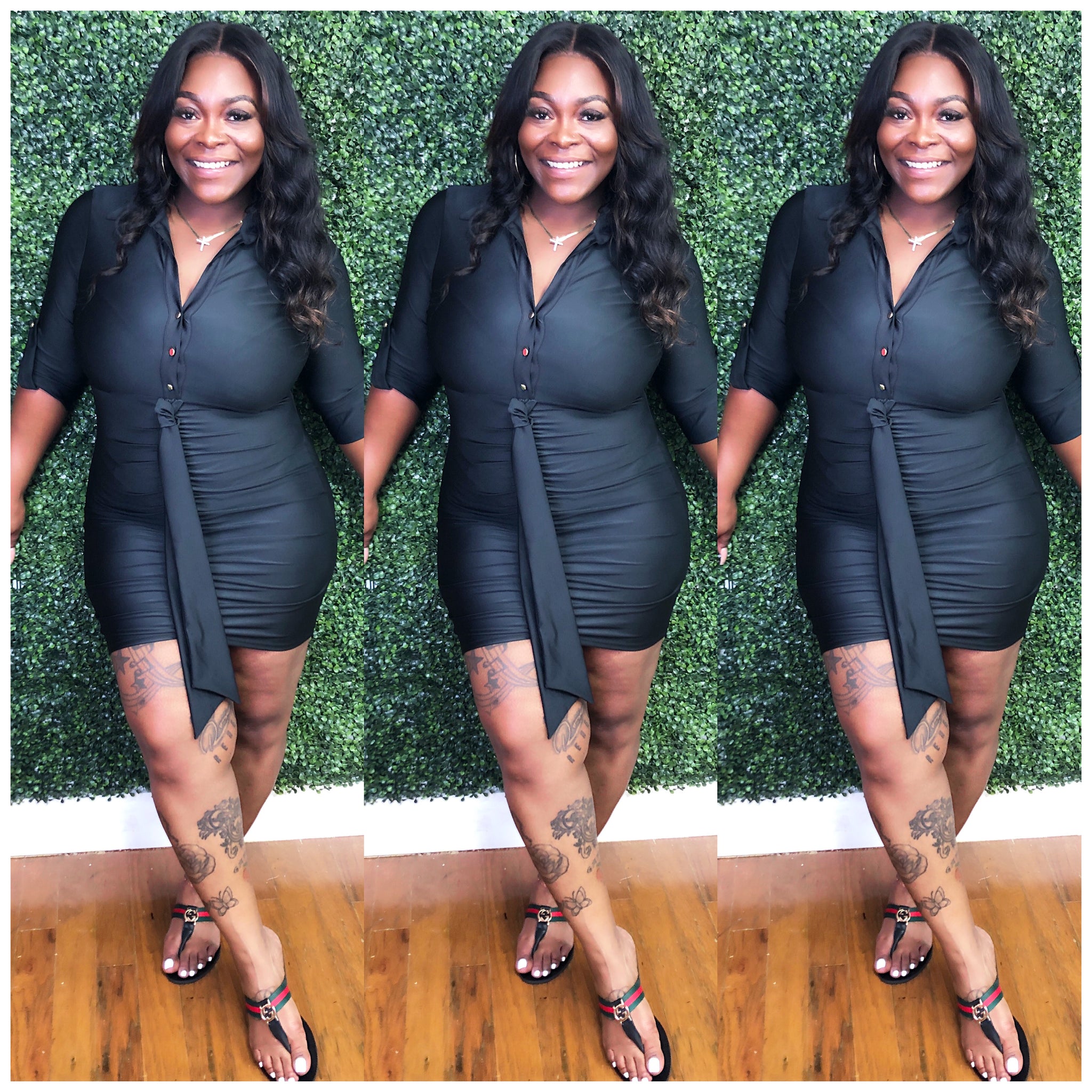Satin plus size solid waist tie button down mini dress. Made with 95% Polyester and 5% Spandex. Modeled in a size 1X.