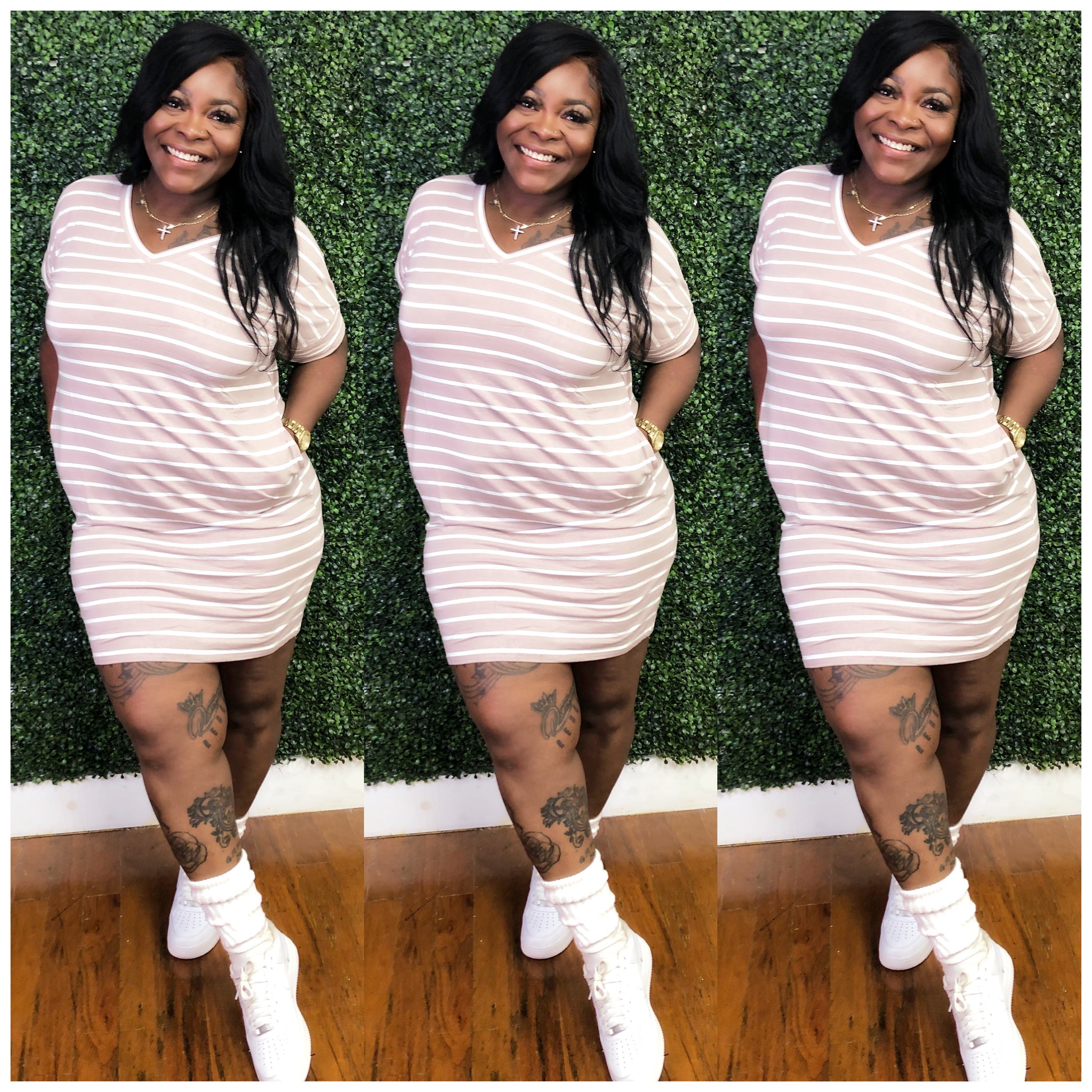 Plus size striped v-neck dress with hidden side pockets. Made with 95% Rayon and 5% Spandex. Modeled in a size 1X.
